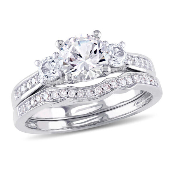Simply stunning, this glistening bridal set is a beautiful beginning to the rest of your lives together. Shimmering in cool 10K white gold, the engagement ring features a dazzling 6.0mm white sapphire flanked by a pair of smaller created sapphires. Sparkling pav??-set diamonds adorn each side of the tapered shank for a look she can’t help but admire. On your special day, a coordinating contoured diamond-lined wedding band completes this significant expression of your love. Radiant with 1/8 ct. t.w. of diamonds and a brilliant buffed luster, this bridal set is everything she imagined and more.