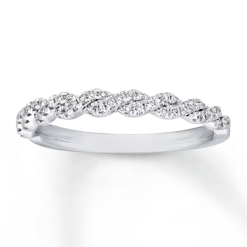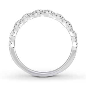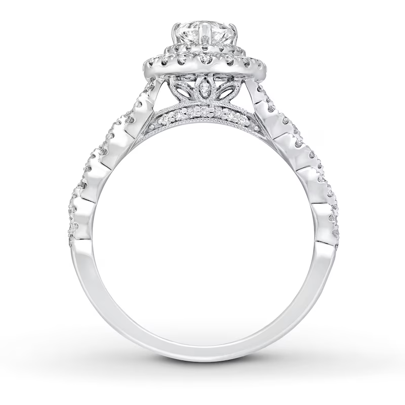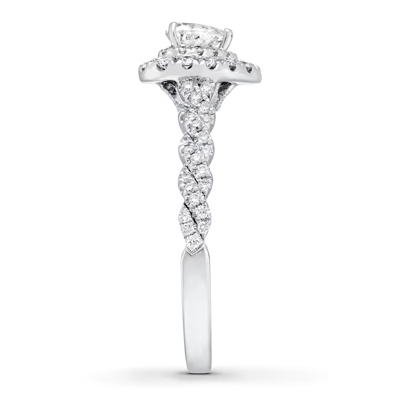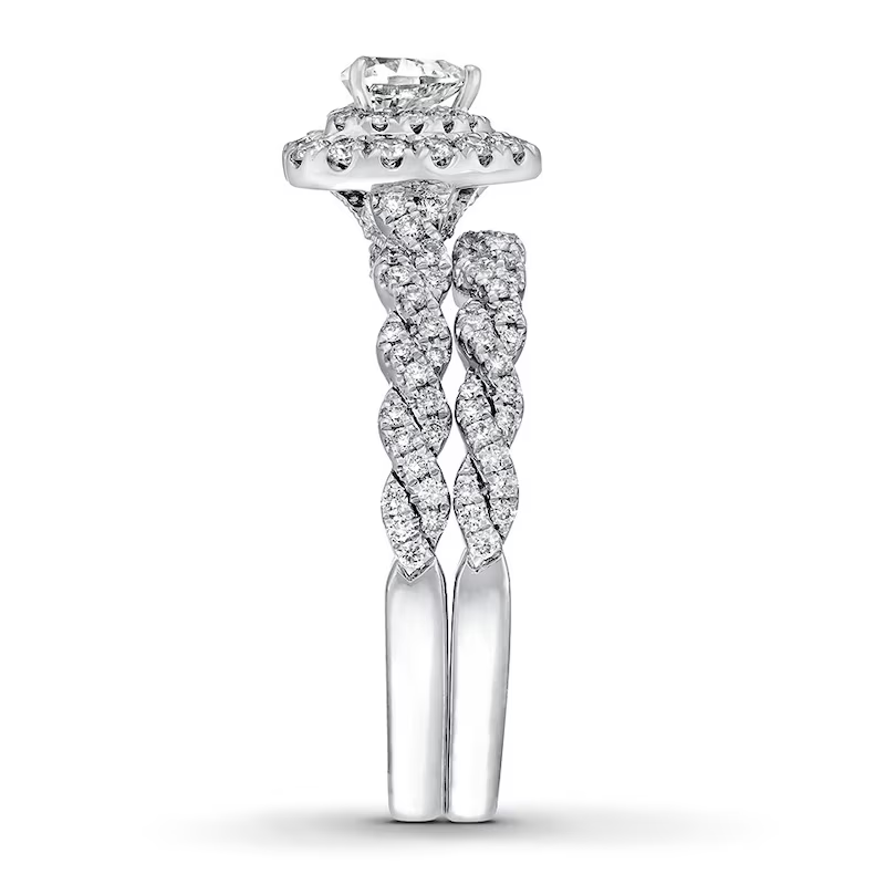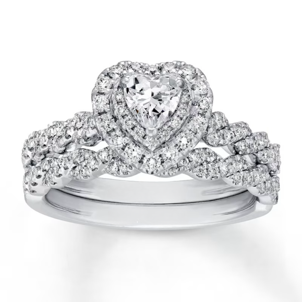 A gorgeous symbol of your love, this sparkling bridal set from features an engagement ring with a romantic heart-shaped diamond haloed by glimmering round diamonds. The band and matching wedding ring are adorned with twists of round diamonds, bringing the total weight of the set to 7/8 carat. The ring is styled in 14K white gold.
