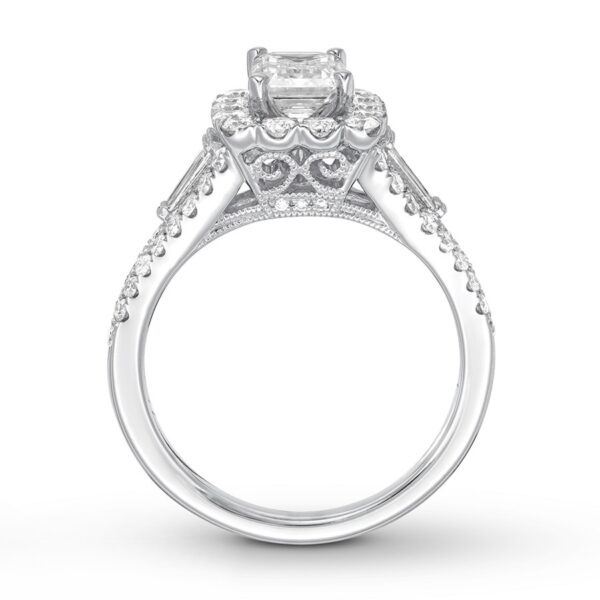 A stellar emerald-cut diamond is framed in lovely round diamonds at the center of this engagement ring. Baguette diamonds adorn each side of the center, with round diamonds flowing along the band of 14K white gold. The ring has a total diamond weight of 1 7/8 carats.