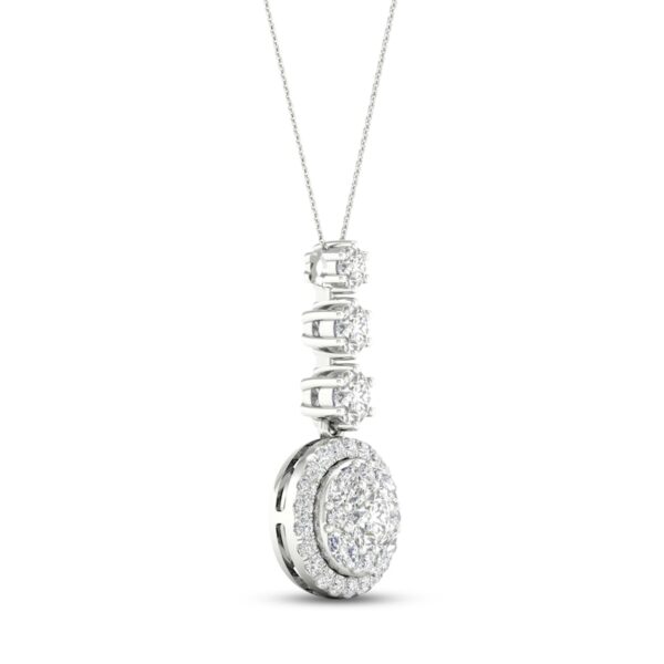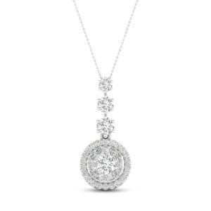 This dazzling necklace showcases a vertical row of three graduating round diamonds suspended over a circular pendant adorned in marquise and round-cut diamonds. Fashioned in 14K white gold, the diamonds total 2 carats in weight. The pendant sways from an 18-inch cable chain that secures with a lobster clasp.