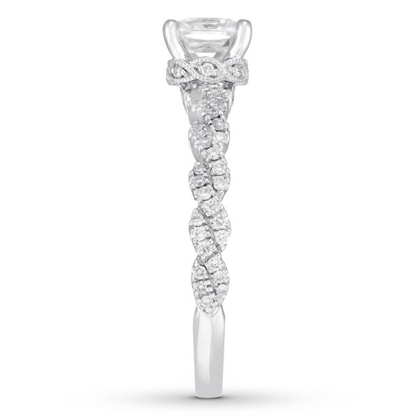 This spectacular engagement ring from Premiere collection features a stunning, modern design enlivened by an impressive array of independently certified diamonds. The brilliant 1-carat, cushion-cut diamond center pairs with dazzling twists of round diamonds on the band for a romantic look. Styled in 14K white gold, the ring has a total diamond weight of 1 1/5 carats.