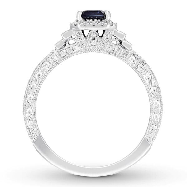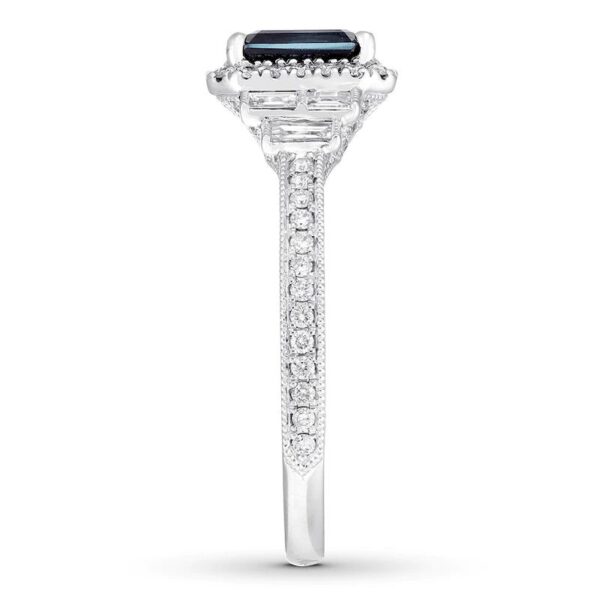 JewelrydesignerbringsArtDecostyleintothemodernerawiththisincredibleengagementring.Theemerald-cutnaturalsapphirecenterisframedbyrounddiamonds,whiletriosofbaguettediamondsshimmeroneithersidetocomplement.Thebanddisplaysmorerounddiamonds,delicatebeading,andcarvedflourishestocompletethedesign.Styledin14Kwhitegold,theringhasatotaldiamondweightof1/2carat.